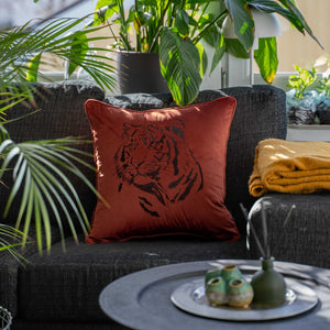 • Tiger | Mahogany är ett kuddfodral med motivet av en tiger broderad på framsidan. Detta kuddfodral i dekorativt sammet ger en lyxig inredningsdetalj i ditt hem. Beroende på hur ljuset träffar tyget, visar detta kuddfodralet många olika nyanser av sin färgskala. Detta eleganta, glänsande kuddfodral förvandlar den enklaste fåtölj, soffa eller stol till en ny inspirerande plats i ditt hem.
