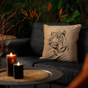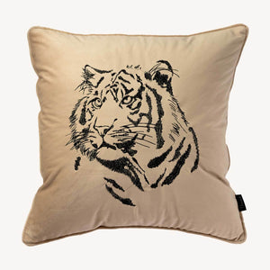 • Tiger | Caffe latte är ett kuddfodral med motivet av en tiger broderad på framsidan. Detta kuddfodral i dekorativt sammet ger en lyxig inredningsdetalj i ditt hem. Beroende på hur ljuset träffar tyget, visar detta kuddfodralet många olika nyanser av sin färgskala. Detta eleganta, glänsande kuddfodral förvandlar den enklaste fåtölj, soffa eller stol till en ny inspirerande plats i ditt hem.