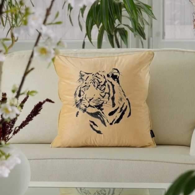 • Tiger | Champagne är ett kuddfodral med motivet av en tiger broderad på framsidan. Detta kuddfodral i dekorativt sammet ger en lyxig inredningsdetalj i ditt hem. Beroende på hur ljuset träffar tyget, visar detta kuddfodralet många olika nyanser av sin färgskala. Detta eleganta, glänsande kuddfodral förvandlar den enklaste fåtölj, soffa eller stol till en ny inspirerande plats i ditt hem.
